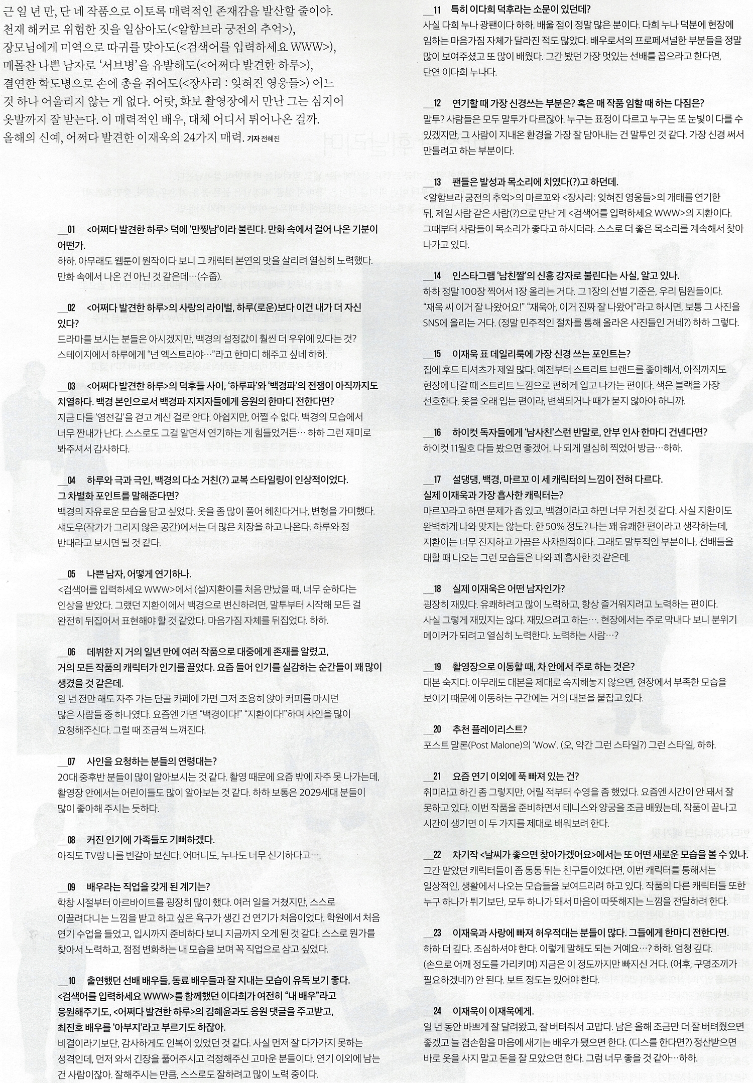 화보 인터뷰는 이번이 세 번째던가? 말하는 걸 보면 센스 있고 머리가 좋다는 생각이 든다. 본인 피셜 공부는 못했다던데 공부 머리와 이쪽은 전혀 다르니까. 이번 인터뷰로 새롭게 알게 된 건 예상외로 아르바이트를 많이 해봤고, 누나가 있으며, 예상대로 옷을 좋아하는 아이라는 것. 그리고 알면 알수록 딱 스물둘이라는 것. 딱 스물둘만큼 밝고 건강하고 반짝거린다.
