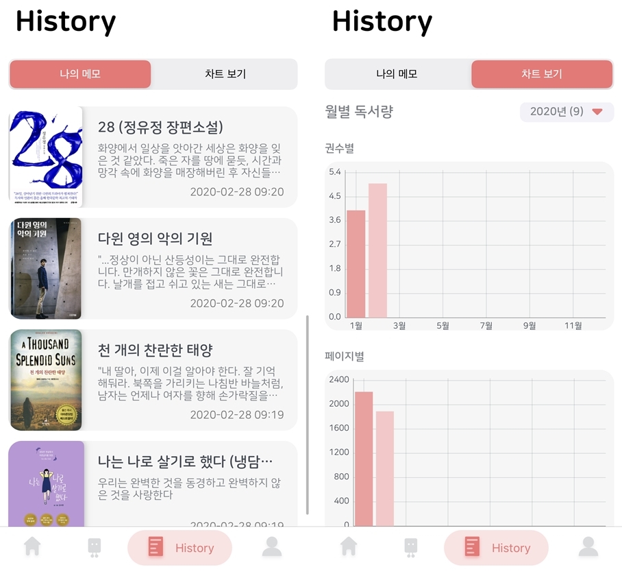 히스토리 탭에선 메모와 차트를 볼 수 있다. 메모는 현재 텍스트만 가능하다. 이미지 업로드가 됐으면 더 좋았겠지만 어차피 블로그에 독후감 올리려면 타이핑해야 하니 상관없고, 차트 보여주는 건 매우 마음에 든다. 일 년 치 기록이 모이면 뿌듯할 듯. <북적북적>은 기본 기능에 충실하면서 사용이 편리하고 디자인까지 귀여워서 간만에 마음에 드는 어플이었다.