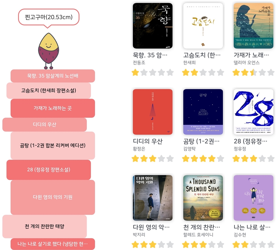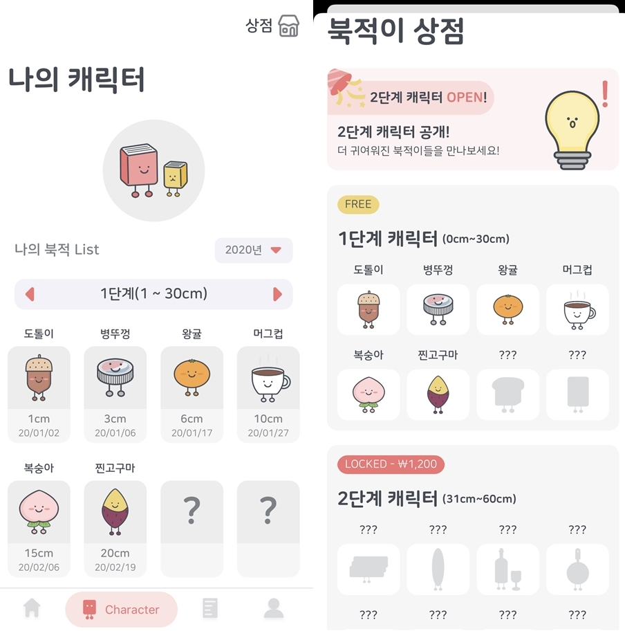 귀염둥이 캐릭터 탭. 나는 현재 책을 20cm를 쌓아서 찐고구마까지 나왔다. 사실 한꺼번에 여러 권을 등록했더니 중간 캐릭터들은 구경도 못 해봤다. 이 페이지에서라도 볼 수 있으니 다행인가요. 높이에 따라 캐릭터가 달라지는데 1단계까진 무료고 2단계부턴 유료다. 결제를 안 해도 책 등록은 계속할 수 있지만, 캐릭터가 바뀌지는 않는다고 한다. 어플 결제 거의 안 해서 카드 해외 결제까지 차단해놨는데 이 어플 때문에 다시 풀어야 하나 고민 중이다. 더 많은 캐릭터를 갖고 싶어요.