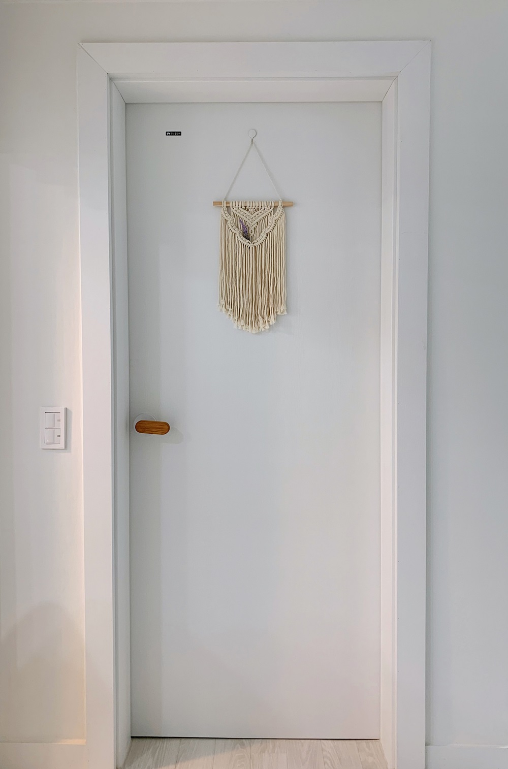 집에 들어오면 정면으로 보이는 곳이 서재라서 서재 방문엔 나름 신경 써서 마크라메 장식을 달아줬다. 문고리는 직지 손잡이 제품. 흔해 빠진 은색 문고리가 싫어서 나무 문고리를 따로 구매해서 달아달라고 부탁드렸다. 가족이 많거나 손님이 많이 온다거나 귀찮은 거 질색하는 분들은 문고리를 사실 때 꼭 반자동을 추가해서 사시길. 안 그럼 잠그고 열 때마다 수동으로 해야 합니다. 은근 귀찮습니다. 문은 사진상으론 민자 화이트로 보이지만 실제로 보면 살짝 나무 무늬가 들어가 있다.