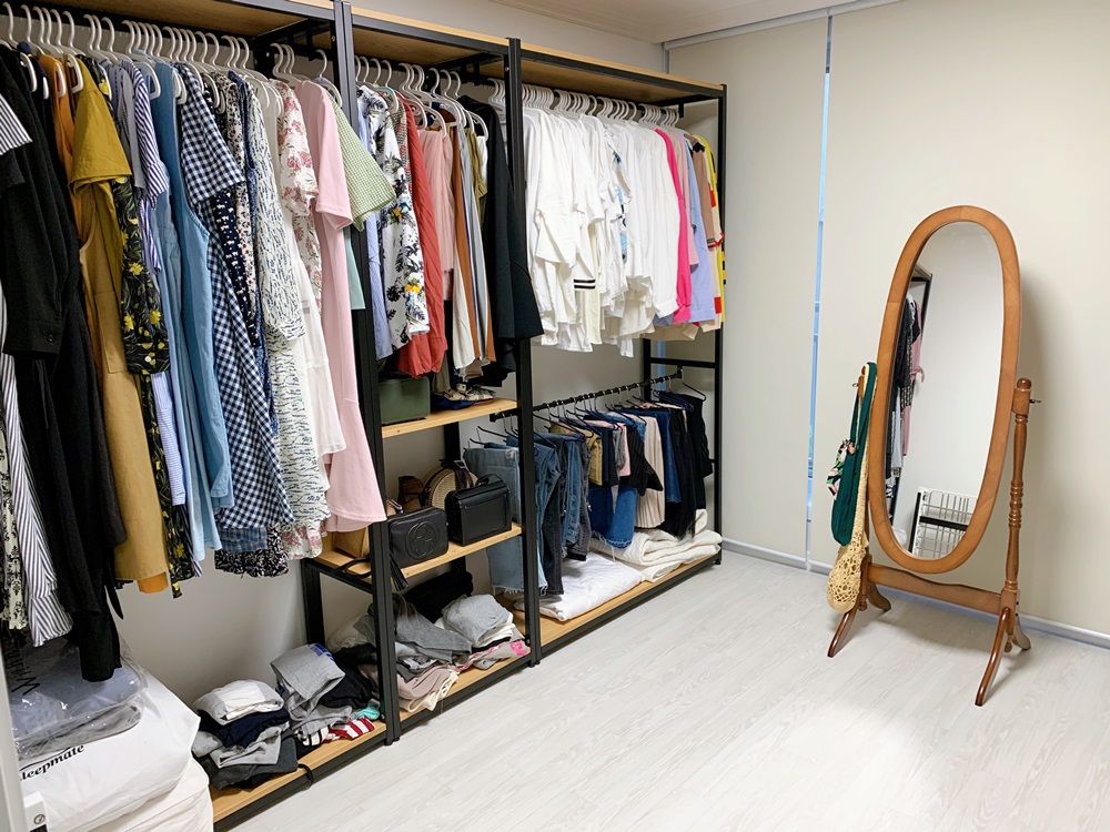 주방 옆에 있는 방은 드레스룸으로 꾸몄다. 깔끔한 붙박이장을 설치하고 싶었으나 우리 집은 붙박이장을 설치할 공간이 나오질 않는다는 걸 깨닫고 시스템 옷장으로 선회. 붙박이장을 설치하려면 벽과 창 사이에 붙박이장이 들어갈 공간이 있어야 하는데 우리 집은 그 공간이 나오질 않아서 설치를 못 했다. 좀 지저분하고 먼지 쌓이는 게 걱정이긴 한데 시스템 장도 설치하고 보니 그리 나쁘진 않다. 밑에 접어둔 옷이랑 이불들은 다 상자에 넣고 싶은데 지금은 에너지 고갈이라 못하겠고 천천히 해야겠다. 드레스룸 전면 창엔 롤 블라인드를 설치했는데 하나 실수한 것이 블라인드를 두 개로 나눴어야 하는데 세 개로 나눴다는 거. 블라인드 사이사이에 갈라진 부분이 생각보다 커서 그쪽으로 빛이 들어온다는 걸 간과하고 블라인드 올리고 내릴 때 편한 것만 생각했다. 전신거울 역시 셀프 조립 제품으로 오늘의 집 특가로 샀는데 가격대비 매우 훌륭하다.