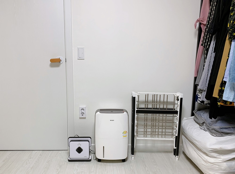 문 옆쪽엔 물걸레 로봇 청소기 브라바, 제습기, 빨래 건조대가 나란히. 제습기 자리엔 스타일러를 놓을 생각인데 가격이 생각보다 비싸서 아직 고민 중이다. 겨울엔 요긴하게 쓰일듯한데 에어컨과 맞먹는 가격이라니 너무 비싸잖아. 브라바는 지인이 사준 건데 우직하게 청소만 열심히 하는 녀석이다. 브라바만 쓰긴 시원치 않아서 스프레이 밀대로 먼저 밀어주고 브라바는 추가로 돌린다. 제습기는 위닉스가 제일 좋다고 해서 샀는데 전에 쓰던 노비타가 더 좋은듯한 느낌적인 느낌이다. 빨래 건조대는 너무 작고 힘없는 걸 사서 후회 중. 이불도 널고 하려면 큰 걸 샀어야 했는데 과거의 나는 왜 저걸 샀을까요?