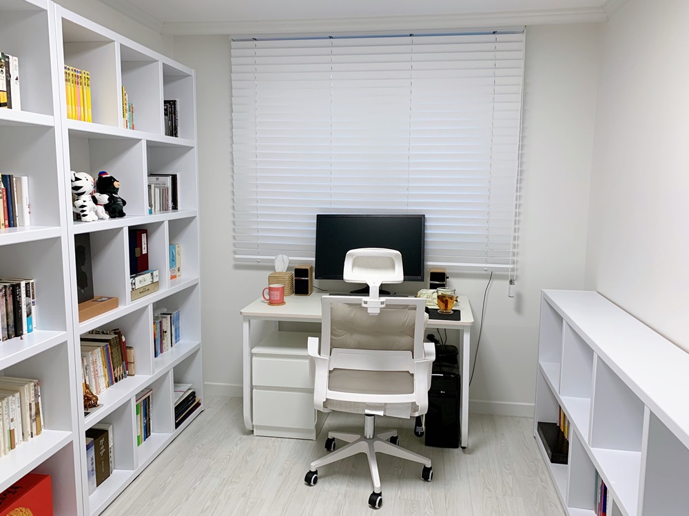 서재이자 컴퓨터 방. 이 방엔 1200*5단 2개, 600*5단 1개, 2000*2단 1개 총 4개의 책장을 놓았다. 이 책장들은 인터넷으로 주문한 제품이다. 야심 차게 가구 사장에게 책장을 맞췄으나 설치까지 했다가 다 빼버린 이유는 첫째로 내가 책장 색깔 선택을 잘못했고, 둘째로 가구 사장이 내 요구 사항대로 책장을 만들지 않았음이다. 가구 제작할 때는 하나부터 열까지 정확히 원하는 바를 전달해야 한다는 걸 이번에 깨달았으니 손해 본 100만 원은 그 수업료라고 생각하기로 했다. 드레스룸 시스템 장도 몇 번이나 잘못 가져와서 완성하는데 몇 주가 걸리고, 저 컴퓨터 책상도 상판을 잘못 가져와서 완성 하는데 며칠이 걸리고, 소파는 들어오는데 무려 한 달 걸렸나? 제대로 한 번에 들어 온 건 침대와 매트리스뿐이었다. 장사하는 사람이 가장 기본인 고객과의 약속도 안 지키고 (성격상 약속 안 지키는 사람 극혐임) 자기 손해 본 것만 몇 번이나 말해서 끝까지 짜증이었다. 건너 아는 사람이라 함부로 할 수 없기도 했고, 성격상 남한테 안 좋은 소릴 못해서 가구 사장이 이상한 소리를 해도 끝까지 참고 넘기긴 했는데 정말 다시는 엮이고 싶지 않은 사람이다. 저 사람 역시 나와 엮이기 싫겠지만.