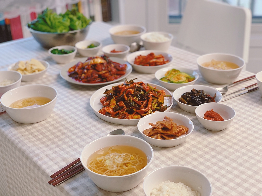 3호네 가족과 함께 저녁 식사. 메인은 돼지고기볶음과 오징어 초무침.