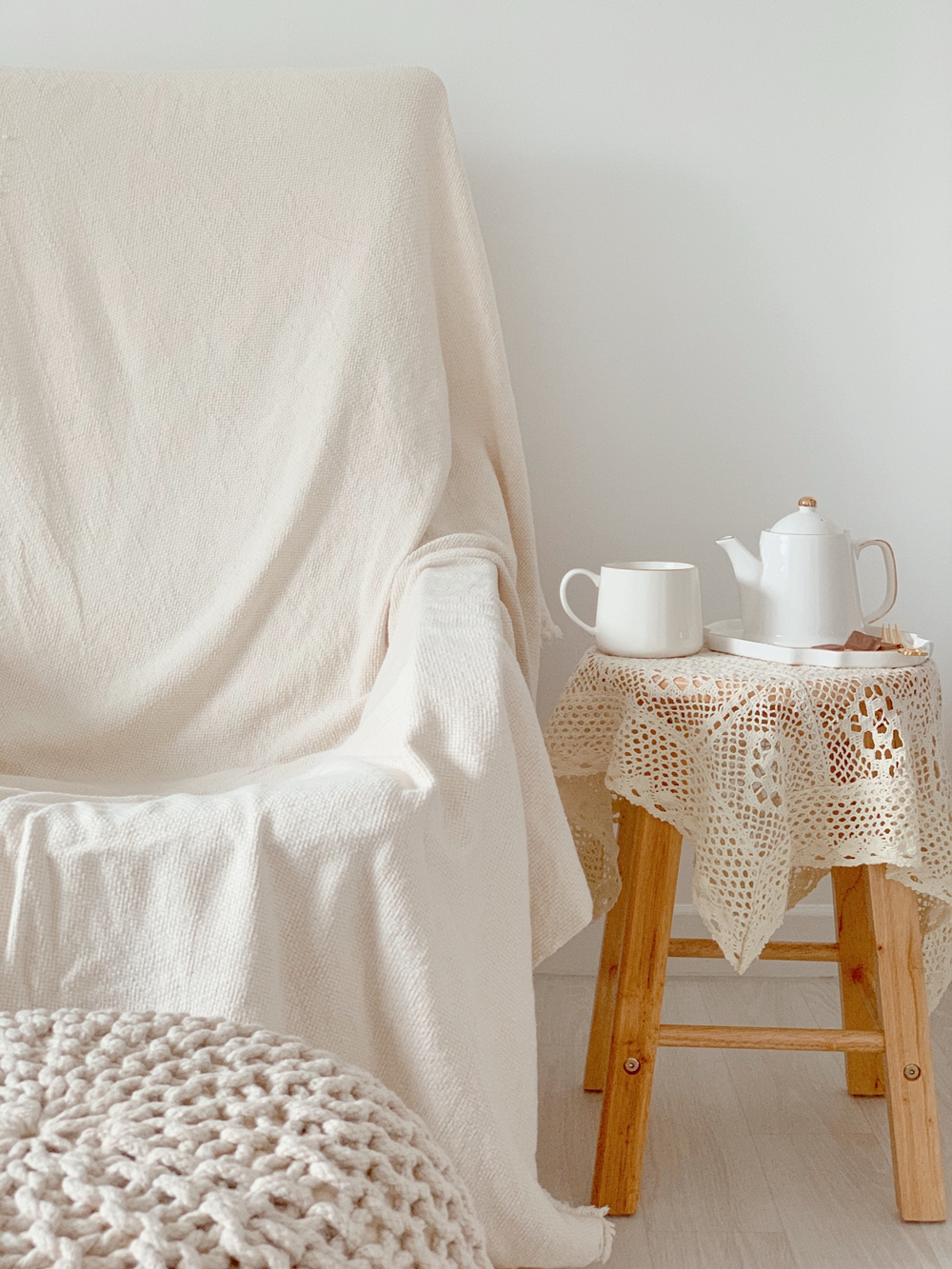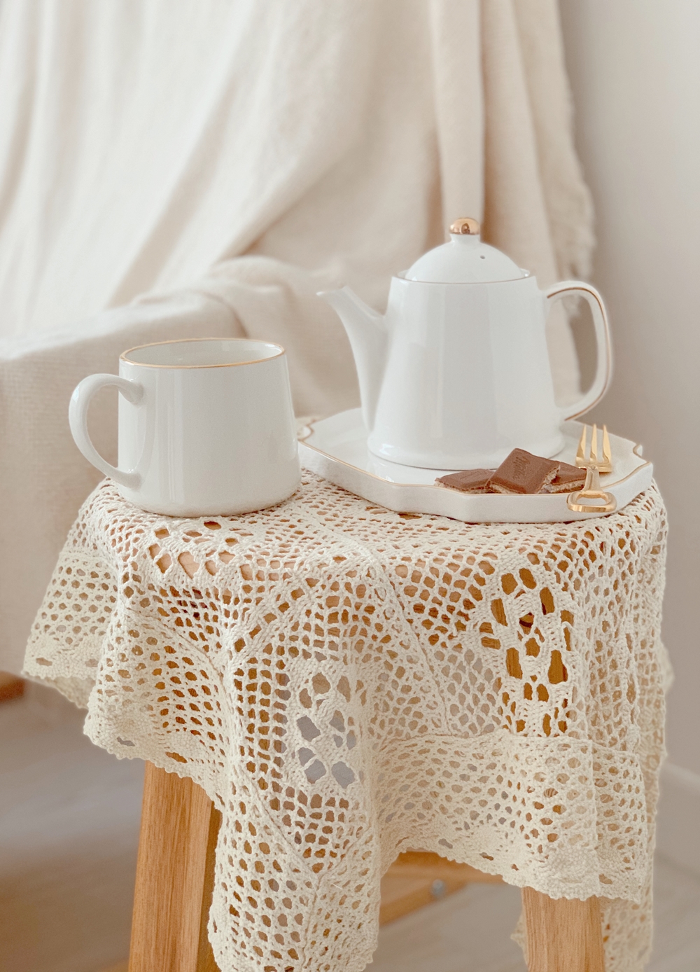 침대 사이드 테이블은 빔과 스피커, 휴지, 컵 정도만 올라가도 비좁아 다른 걸 놓을 공간이 없어서 의자 옆에 작은 테이블 하나를 더 놓으려고 열심히 찾아 헤맨 결과 거실에 있는 나무 스툴이 눈에 들어와서 똑같은 거로 하나 더 샀다. 뚝딱 조립한 후에 레이스를 씌우니 간식용 사이드 테이블 완성. 높이나 크기 모두 마음에 든다. 티포트 따로 컵 & 디저트 접시 따로 산 건데 마치 세트 같다. 의자에 앉아 영상 보면서 과일도 먹고 과자도 먹고 차도 마시면 을매나 좋게요.