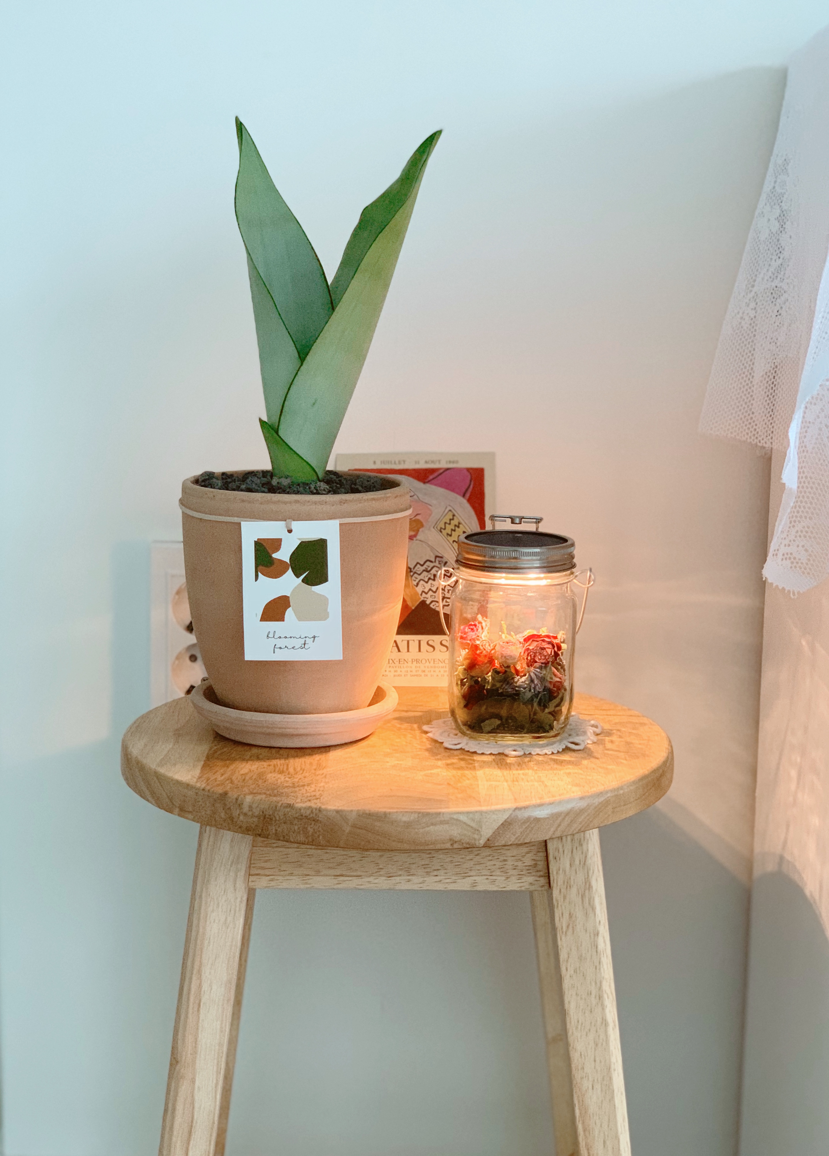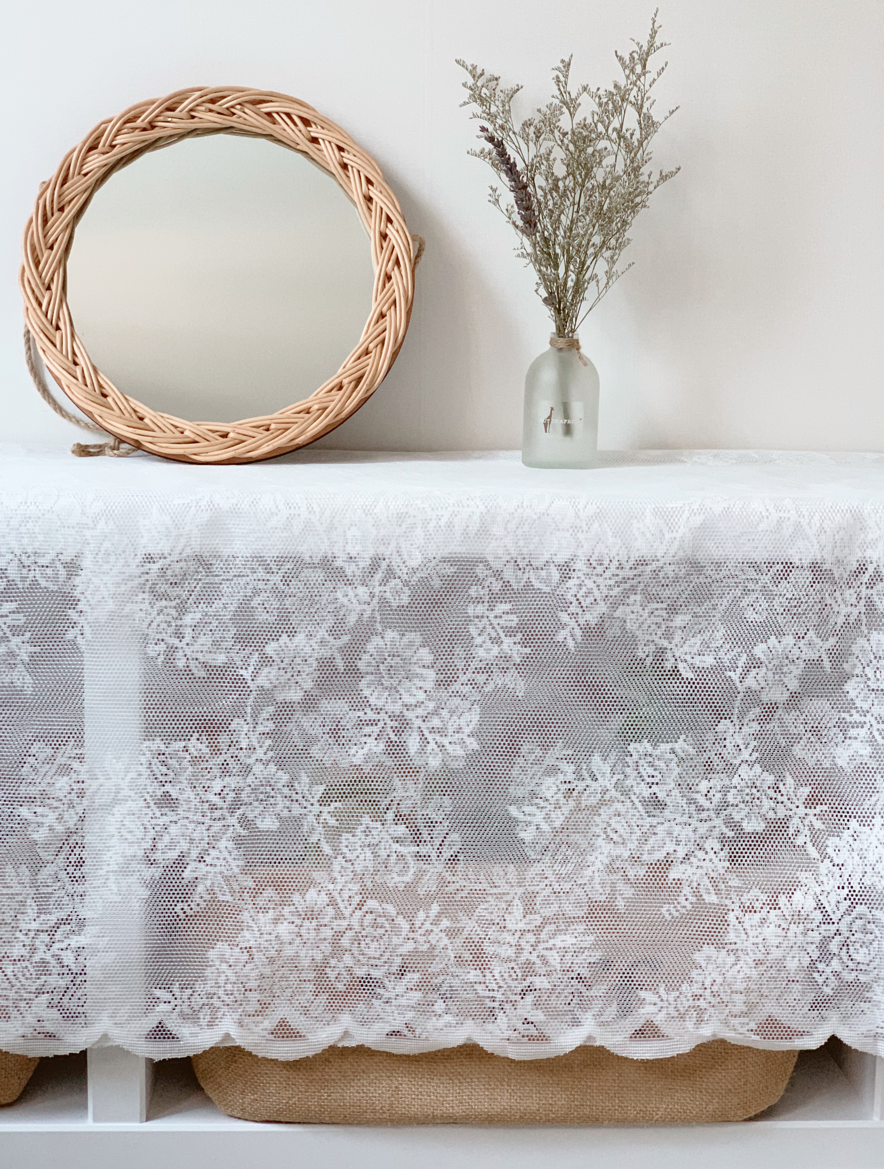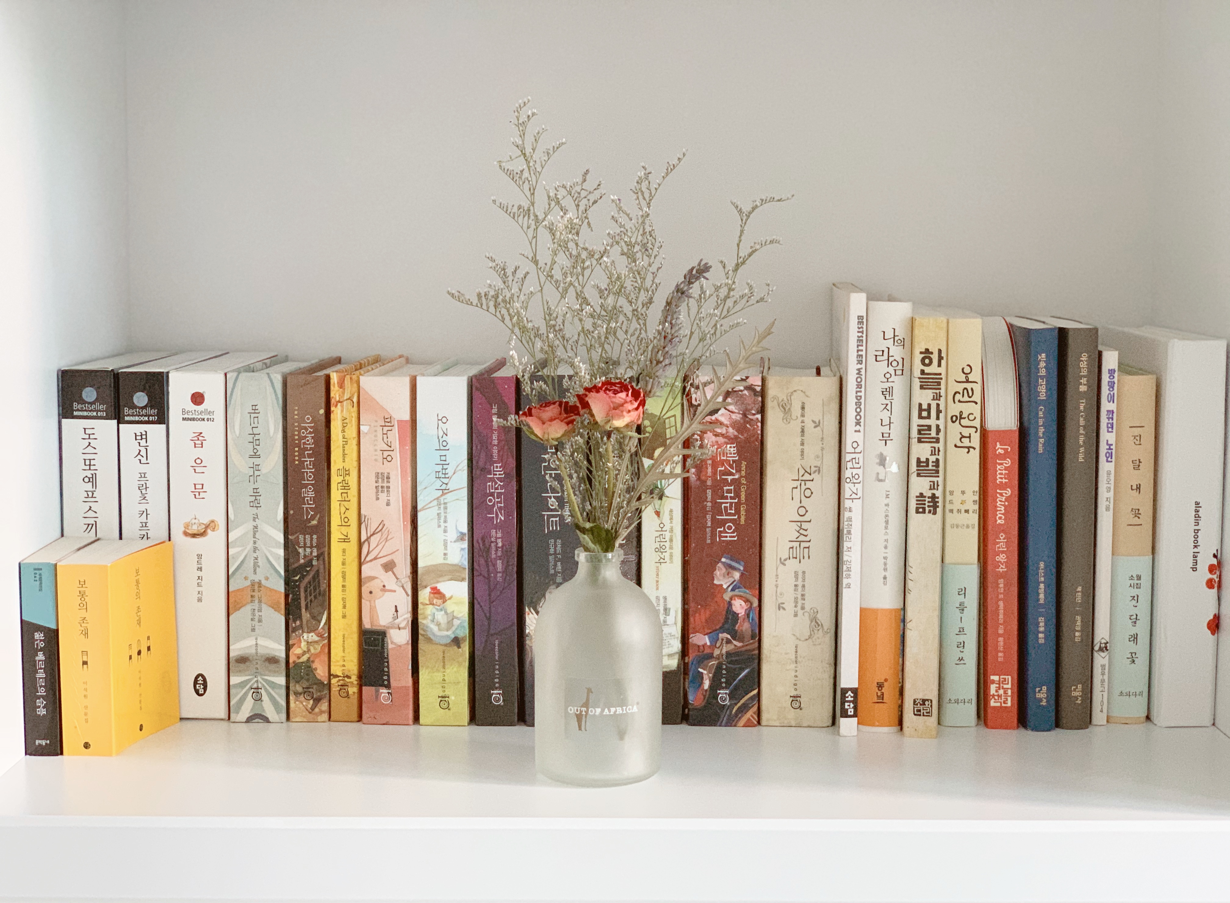 서재 낮은 책장 위 작품2는 미스티 네추럴 + 라벤더. 책장 위 레이스 천은 이케아 커튼이다.