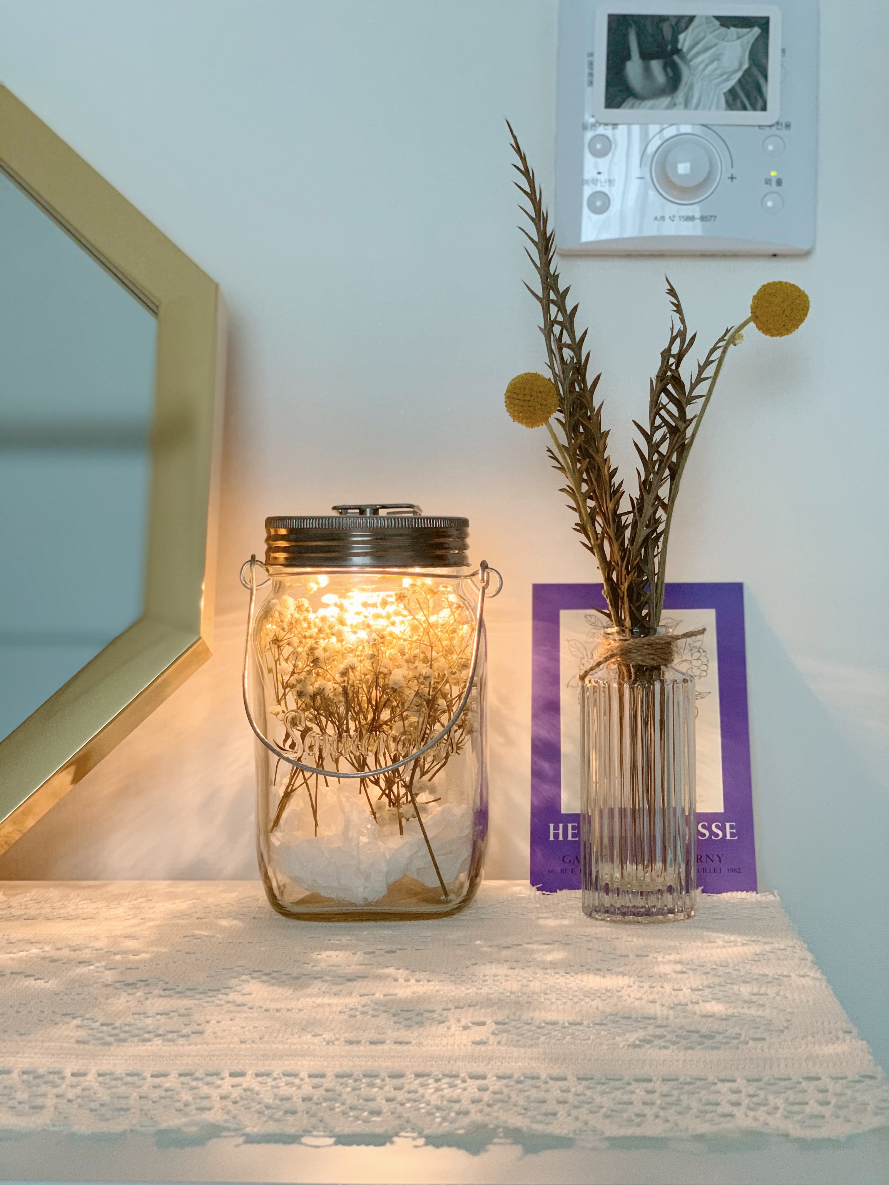 마지막 작품8, 9은 화장대 위에. 안개꽃이 많이 남아서 큰 선넨글라스 안에 넣었고 옆엔 골든볼과 이반 호프.