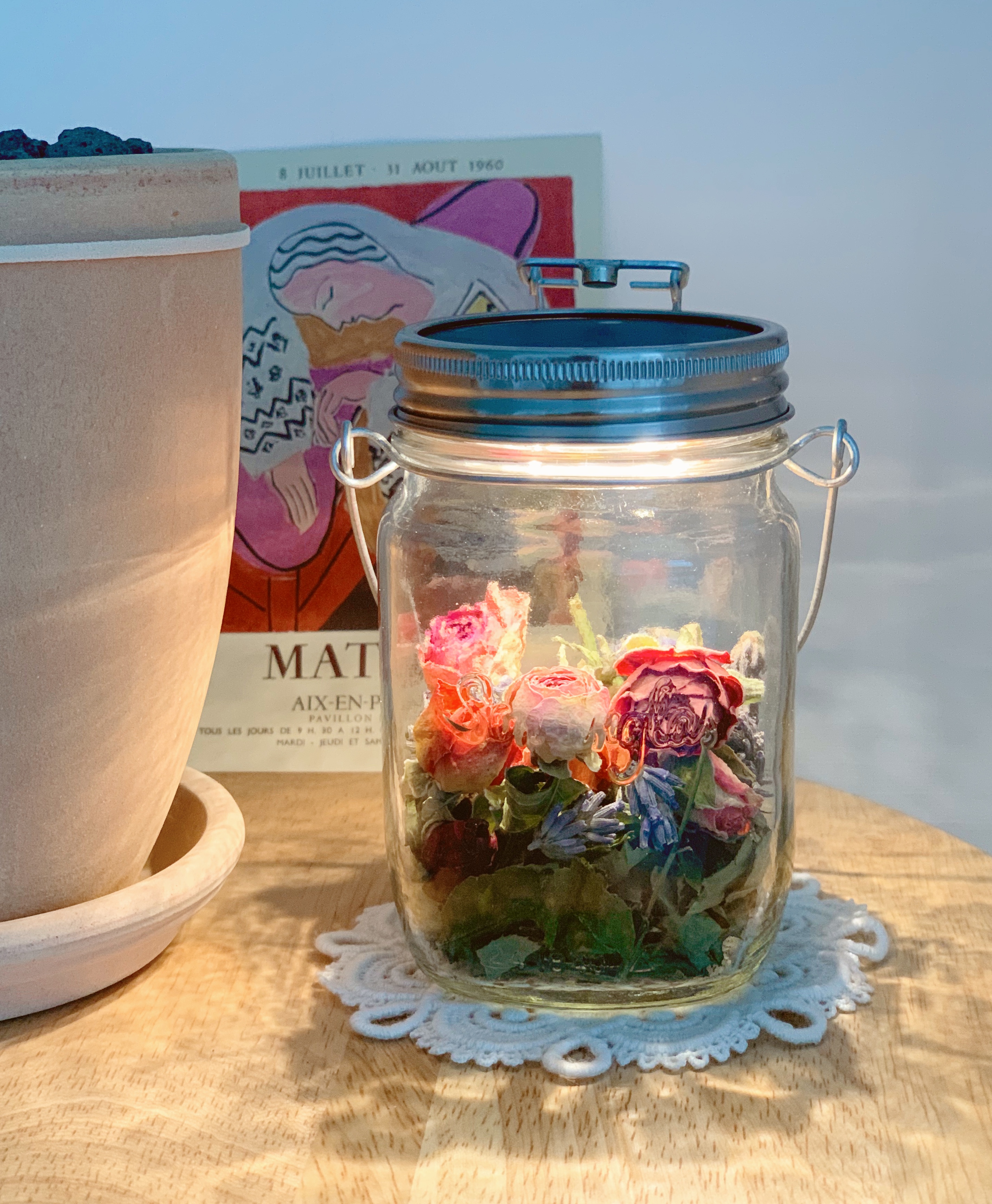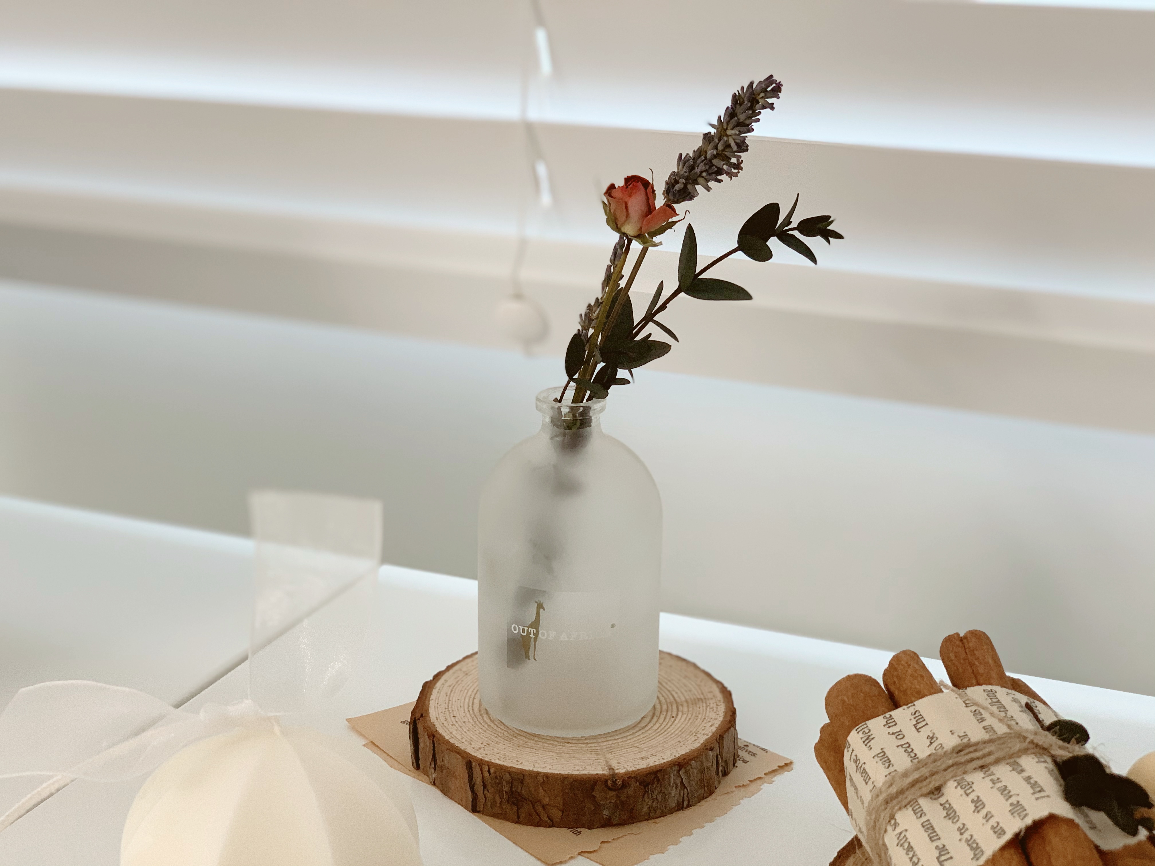 작품6은 이케아 화병 + 미니 장미 + 라벤더 + 미스티 네추럴 조합. 거실 책장 위에 안착.