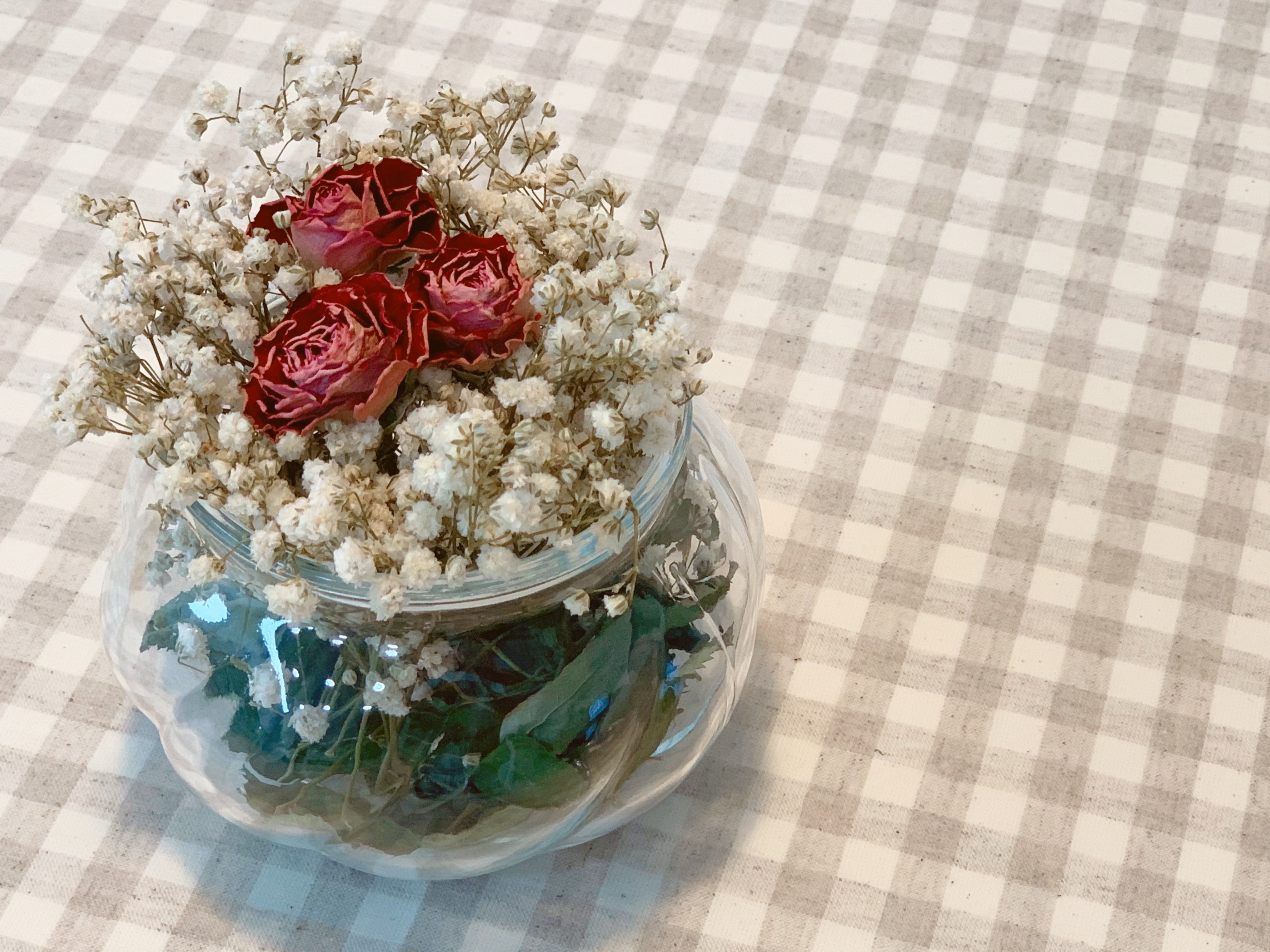 작품3는 미니 장미 송이와 잎, 라벤더를 선넨글라스 안에 넣었다. 실물로 보면 얘가 젤 예쁨.