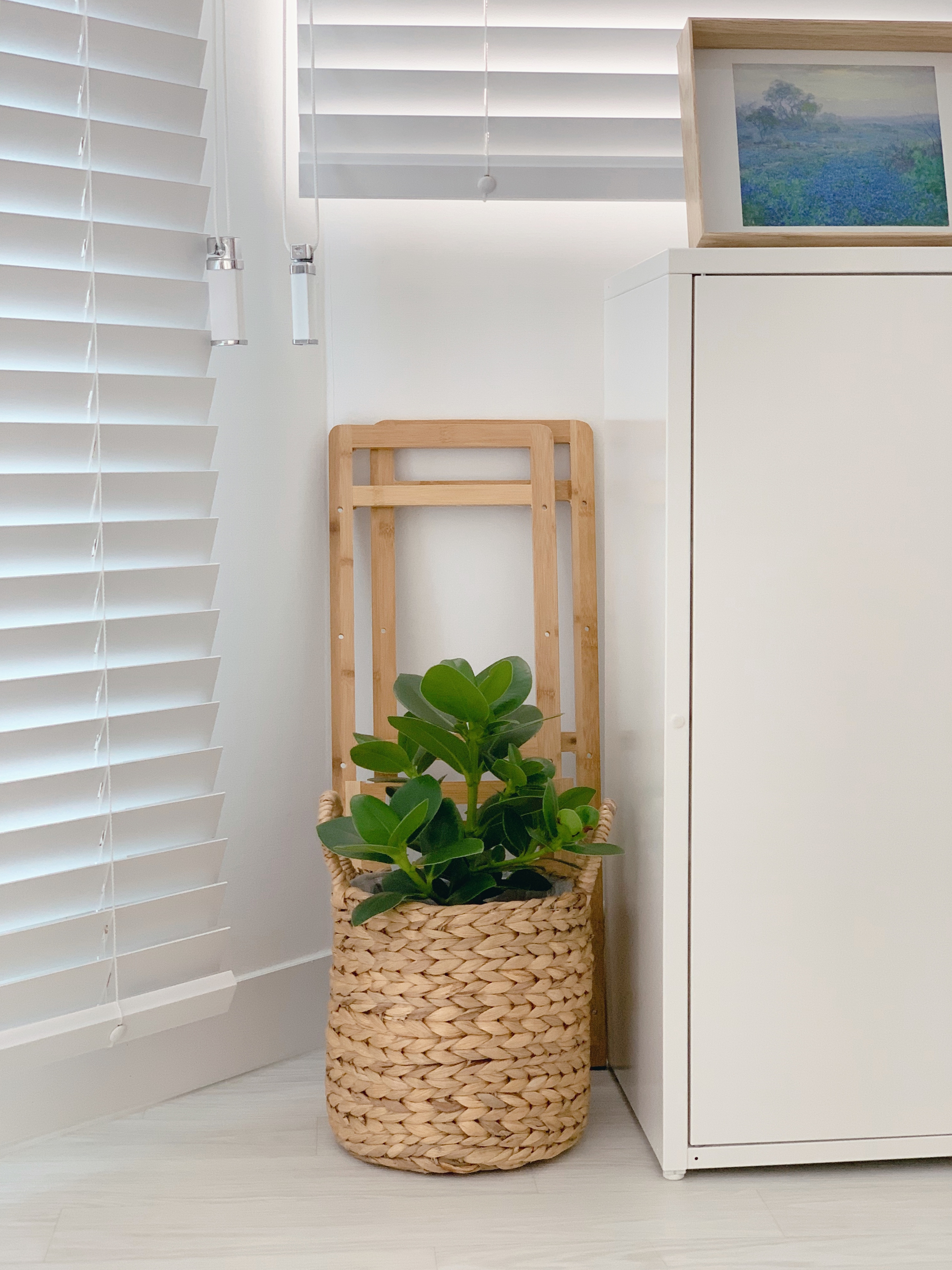 나무 스툴 위에 있던 스탠드를 책장 위로 올리고 그 자리엔 반려 식물 4호 문샤인과 미니 선넨글라스 배치