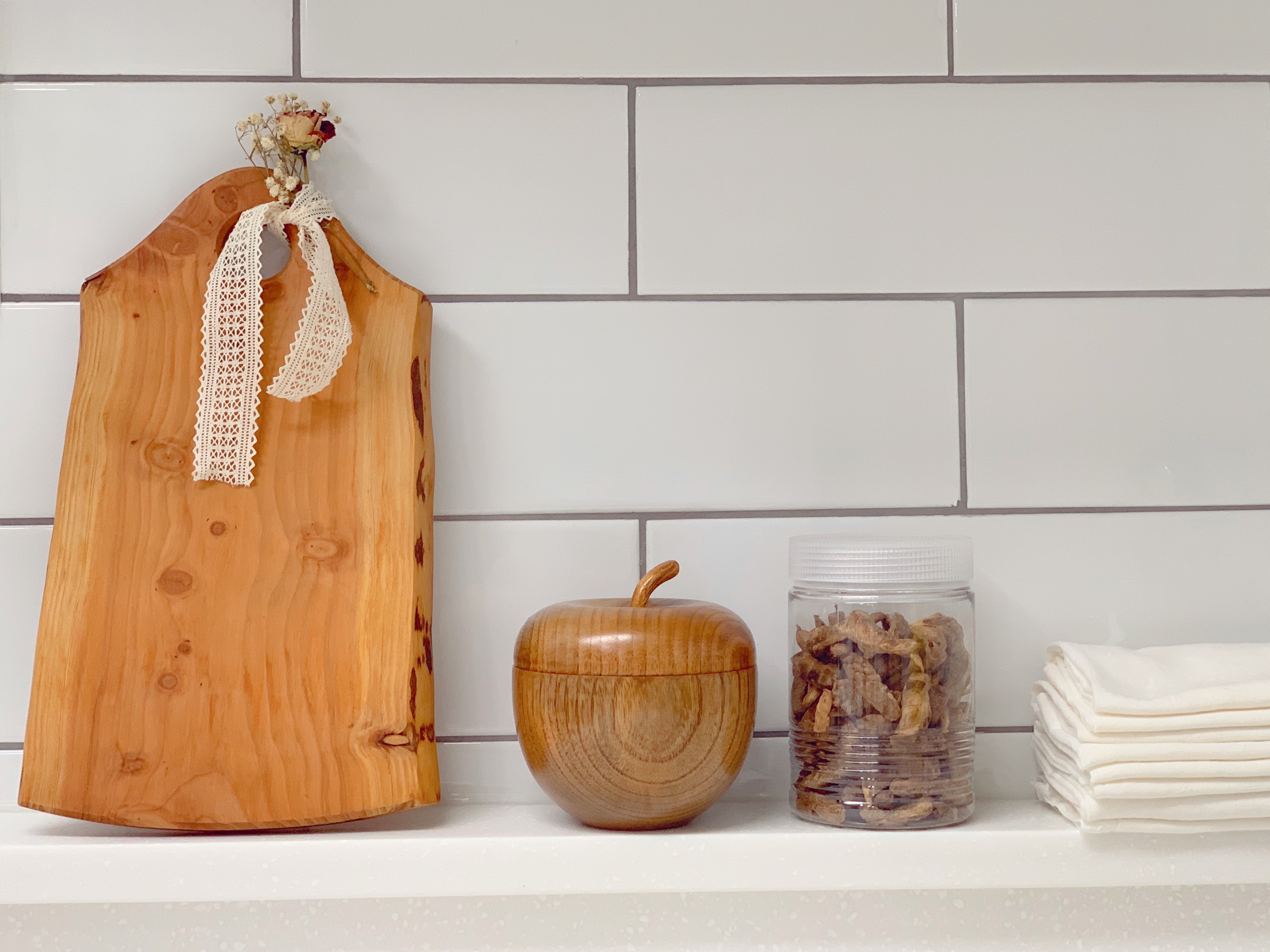 언젠가 작은어머니가 선물로 주신 플레이팅 도마, 약보관함으로 쓰고 있는 사과 보석함, 무차, 소창 행주