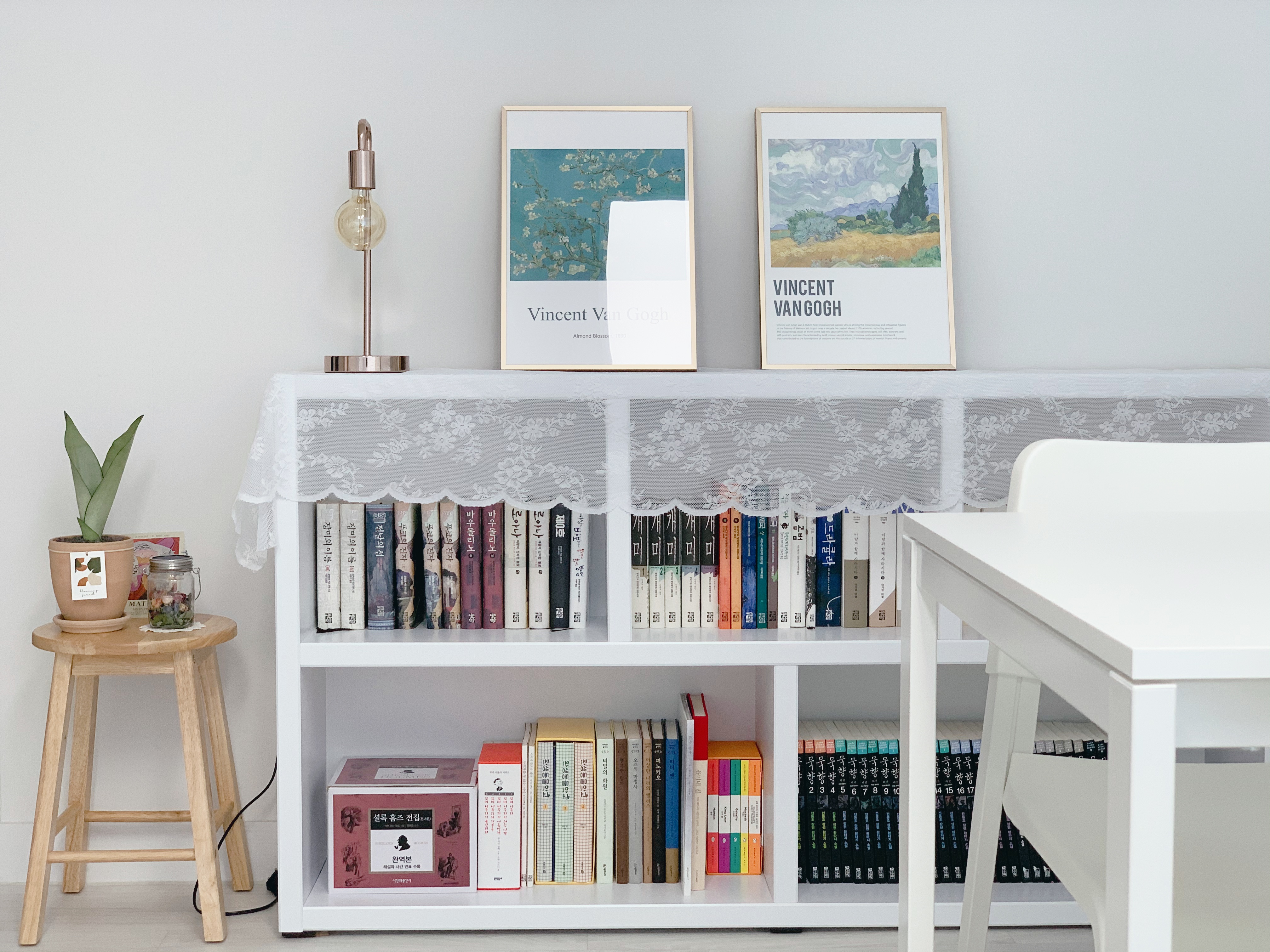 2단 책장 위엔 이케아 커튼을 사서 덮었고