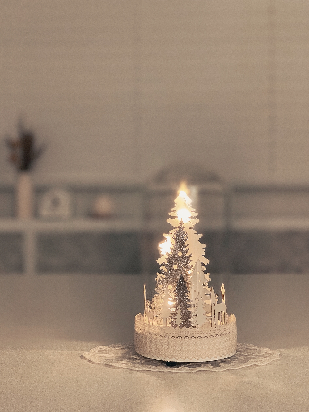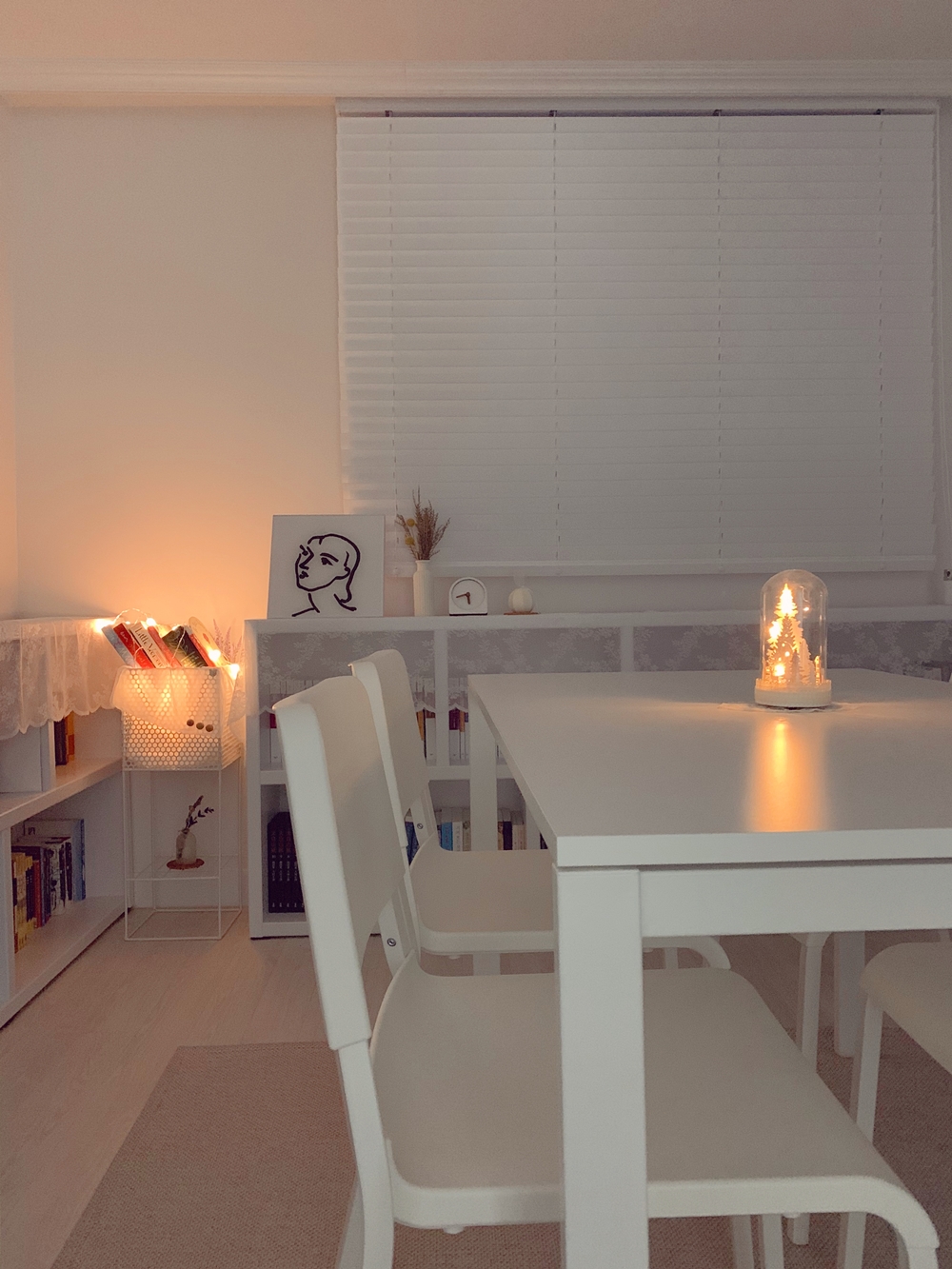 크리스마스 장식은 하고 싶은데 너무 크거나 알록달록한 건 싫어서 찾고 찾다가 작은 유리돔 장식을 샀다. 하지만 실물을 보자마자 대실망. 유리돔과 받침대 연결 부위에 본드 자국이 그대로 다 보이넴? 허접한 마감에 상처받았지만 전에 사둔 레이스를 둘러주니 그럭저럭 볼만해졌다. 실물보다 사진이 잘 나오는 녀석. 원래는 책을 쌓아서 책트리를 만들고 싶었는데 공간을 많이 차지하고 먼지가 쌓일 거 같아서 패스. 음악+조명+눈까지 날리는 워터볼을 살까 고민하다 비싸서 저걸 산 건데 내년엔 워터볼을 살지도 모르겠다. 싼 게 비지떡이라는 사실을 잊지 말고 비싸도 제대로 된 걸 삽시다.