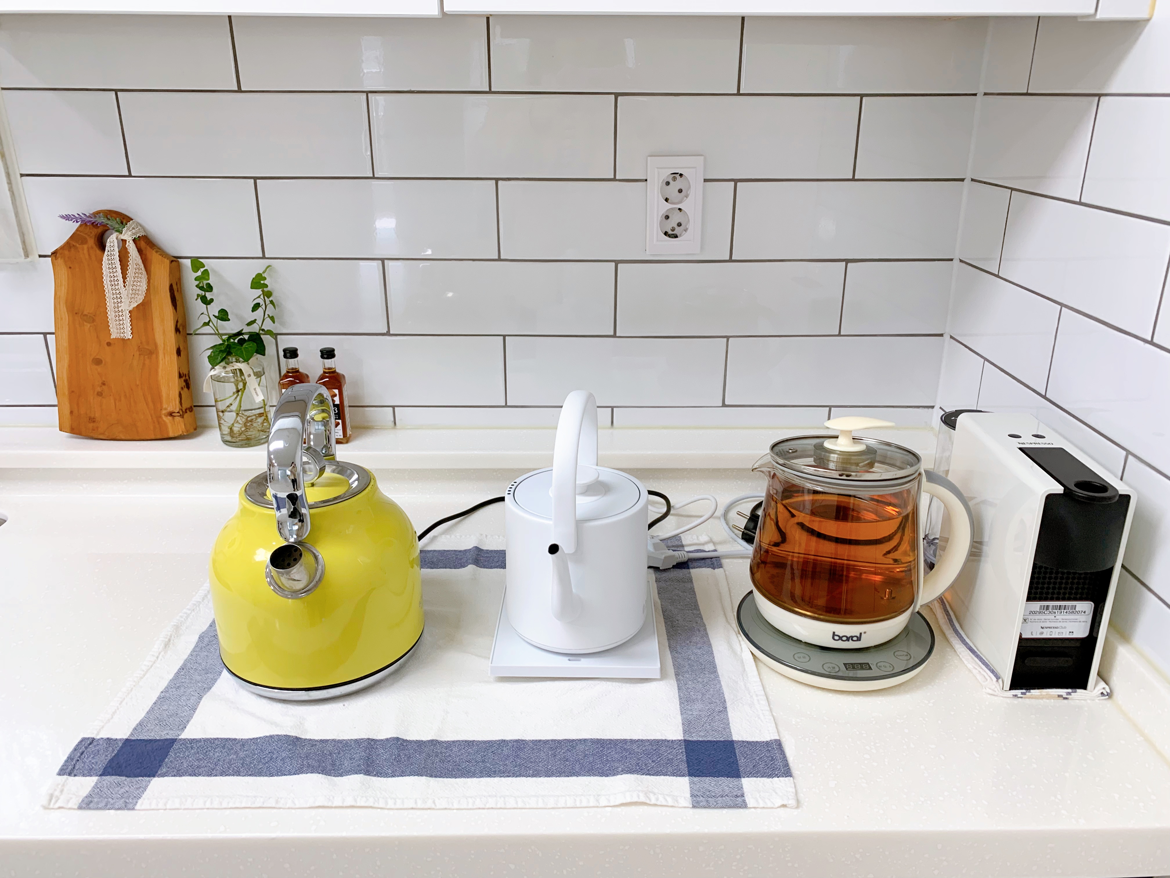 혼자 사는데 전기포트가 무려 세 개! 이게 다 쓰임새가 다른데 맨 오른쪽 유리포트는 식수용. 루이보스 넣고 끓여서 항상 저기 두고 먹는다. 보온 기능이 있는데 거의 안 쓴다. 그리고 왼쪽 노란색은 파쉬 물 주머니 물 끓이는 용도로 쓰고 있다. 겨울엔 전기장판 대용으로 파쉬를 끌어안고 자는데 이게 고무 재질이다 보니 물에 고무 냄새가 배어서 포트에까지 냄새가 나서 포트를 버리긴 아깝고 파쉬 전용 포트로 쓰기로 했다. 가운데 흰 포트는 러셀홉스껀데 최근에 샀다. 드립커피나 컵라면 이런 거 먹을 때 쓴다. 그래서 전기포트가 세 개가 됐다는 이야기였습니다. 캡슐 커피 머신은 항상 저 자리에 있는데 요즘 드립 커피를 먹느라 거의 안 쓰고 있다.