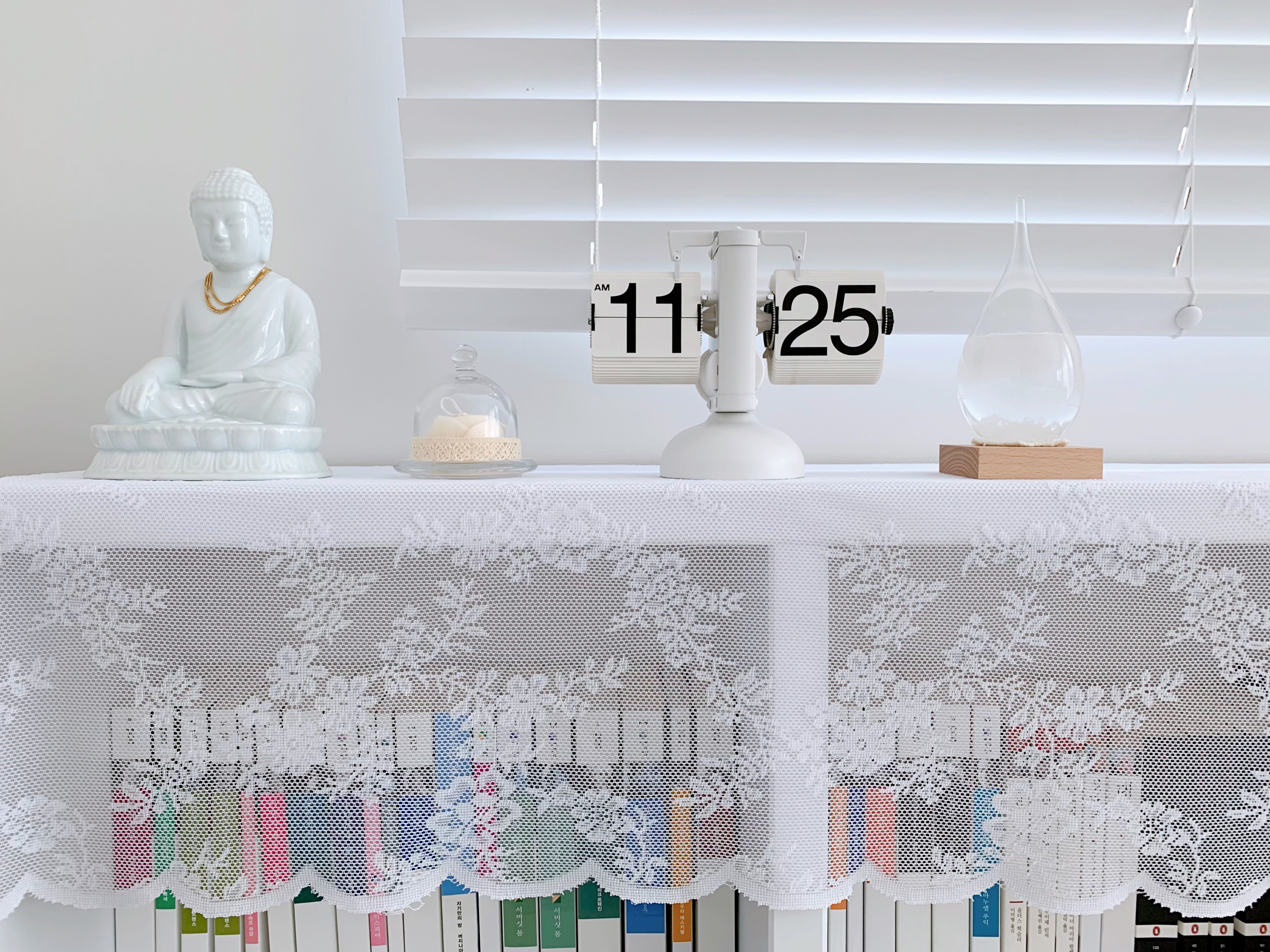 우리 부처님은 여전히 잘 계시고 옆에 장식품 두 개 바꿨다. 유리돔에 든 튤립캔들과 날씨에 따라 결정 모양이 바뀐다는 템포드롭인데 딱히 모양이 바뀌는 건 모르겠고 그냥 예뻐서 샀다. 저 캔들은 생각보다 너무 작아 존재감이 없어서 다른 오브제를 살까 궁리 중이다. 나를 꾸미는덴 돈을 안 쓰는데 집 꾸미는덴 아주 아낌이 없다.