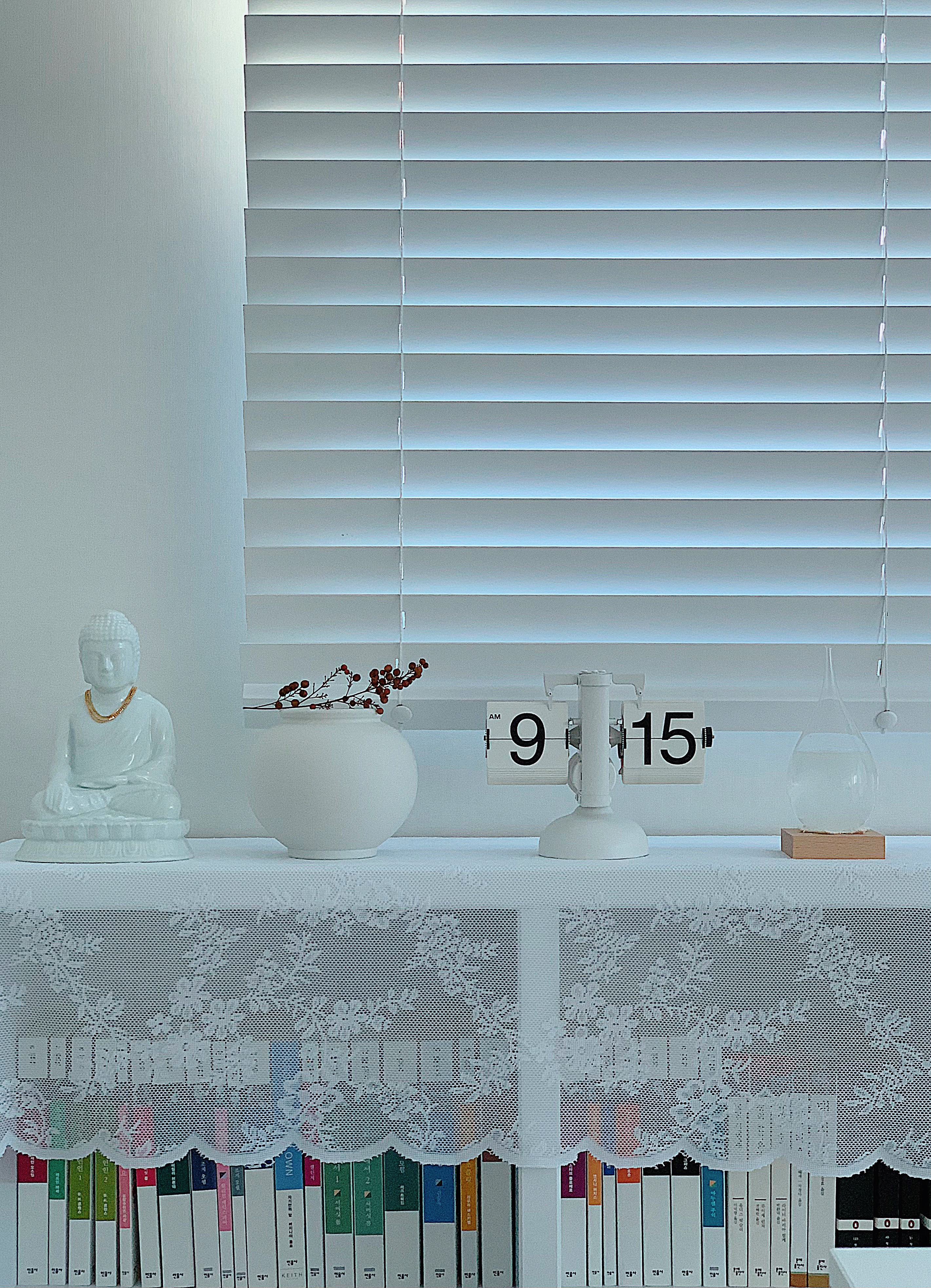 저 자리에 있던 캔들이 너무 작고 마음에 안 들어서 화장대로 옮기고 달항아리로 교체했다. 옆에 불상이 유광이라 같은 유광으로 살까 하다가 모양이 동그래서 그런가 유광은 어딘가 요강 같은 느낌이 들어서 무광으로 샀다. 받아보니 작은 잡티가 꽤 많은데 멀리서 눈으로 보면 안 보여서 그냥 쓰기로 했다. 사고 보니 국중박 뮤지엄샵에서 좀 더 작은 크기의 달항아리를 파는 걸 발견했는데 그 제품이 완성도가 높아 보여서 좀 아쉽긴 했다. 저 불상도 국중박 뮤지엄샵에서 산거라 잘 어울렸을 거 같은데 이미 사버렸으니 어쩔 수 없지. 이제 정말 이걸로 오브제 쇼핑은 끝이다.