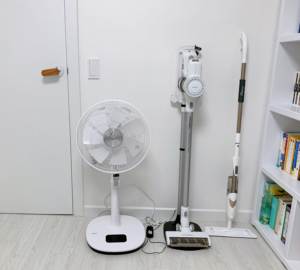 서재 문 옆엔 몇 년 전에 산 신일 선풍기와 디자인이 예뻐서 산 케치웰 무선 청소기, 스프레이 밀대가 있다. 이 집의 최대 단점이 다용도실이나 베란다가 없다는 거다. 다행히 세탁기는 보일러실에 놓을 수 있어서 통돌이 13kg짜리 넣어놨는데, 저런 청소용품이나 소형 가전은 따로 둘 곳이 없다. 옥상 나가기 전에 작은 창고가 있긴 한데 매번 거기 넣어두고 꺼내 쓰기도 불편하고 침실이나 거실에 두긴 싫으니 방 한쪽 벽에 저렇게 두는 게 최선이다. 정리 안 되고 저렇게 지저분하게 나와 있는 거 너무 싫은데 붙박이장 설치도 못 하고 방법이 없다. 그나마 제품들이 흰색 계열이라 깔끔해서 참고 쓴다.