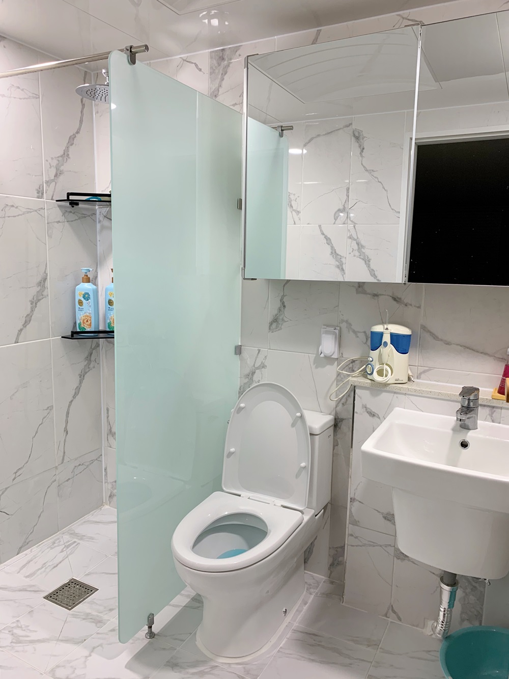 대리석 타일로 통일한 욕실. 고르는 타일마다 없다고 해서 흔해빠진 대리석 무늬로 욕실 두 개를 통일했다. 욕실 수리 견적은 거의 원가로 받았는데 (욕실 두 개 올수리 380) 자세히 보면 허술하기도 하지만 대체적으로 만족한다. 가격에 맞추느라 도기나 수전이 없어 보인다는 게 아쉽지만 리모델링은 투자한 만큼 결과가 나오는 거니까 불만은 없다. 이 정도만 돼도 수리 전 욕실에 비하면 거의 궁궐이나 다름없다. 예전 욕실은 정말 ㅠㅠ 침실에 딸린 욕실은 여기보다 더 작다.