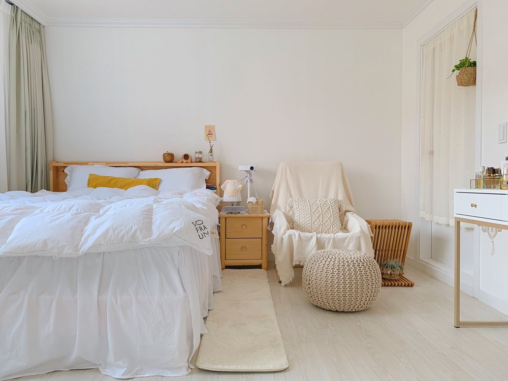 지금 침실은 이런 모습. 아직 추워서 구스 이불 덮습니다. 현재 러그는 치운 상태. 장모 러그라 더워 보여서 치웠는데 대체할 러그를 찾아봐도 마땅한 게 없다. 여름엔 그냥 살아야지. 의자 옆 사이드 테이블도 바꾸고 싶어서 새로 샀는데 100%까진 아니고 70% 정도 마음에 든다. 사이즈 작은 걸 찾다 보니 보조 의자를 테이블로 씁니다.