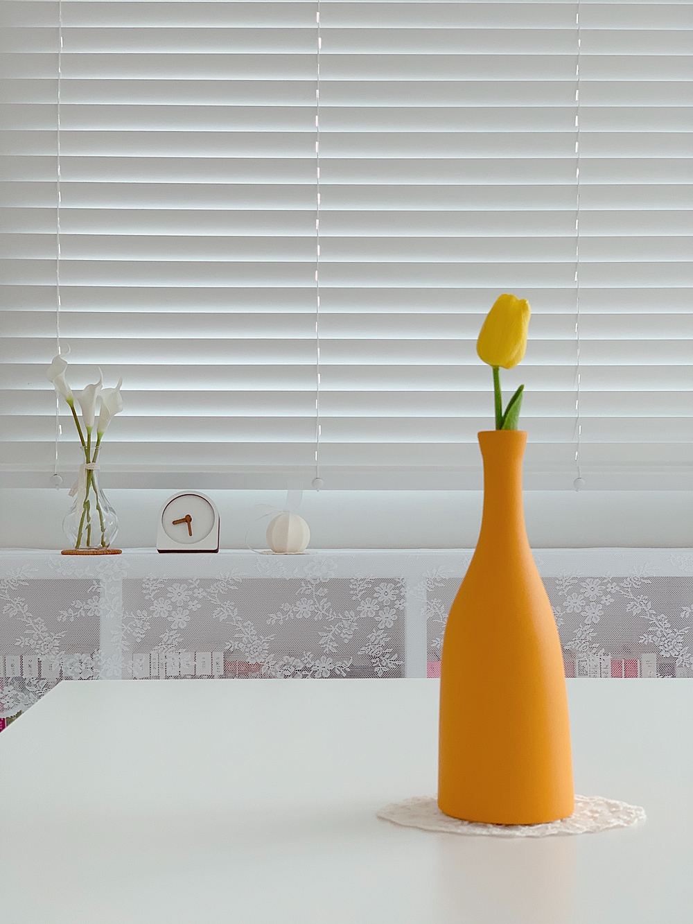 온통 하얀 거실에 포인트 주려고 산 머스터드 화병. 몇 달 방치한 보존화를 버리고 이번엔 조화를 샀다. 생화가 제일 예쁘지만 2주면 시들어 버리는지라 ㅠㅠ 두세 번 어설픈 꽃꽂이를 해본 결과 이게 은근히 시간도 많이 들고 생각보다 예쁘게 만지기가 어렵더라. 단순히 꽃만 잘 꽂으면 되는 게 아니라 꽃과 화병도 조화롭게 어울려야 하고 그 꽃을 놓는 장소에도 어울려야 해서 어렵다. 생화라면 손질과 관리도 플러스가 되니 더 어렵겠지요. 그래도 가끔은 생화를 사봐야겠다.